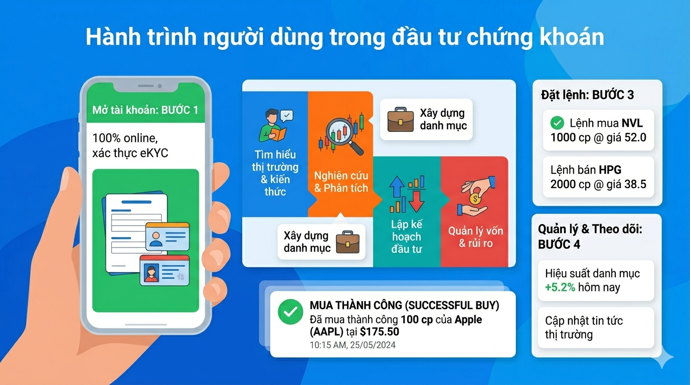 Một người dùng không mở ứng dụng chứng khoán chỉ để “xem giá”. Họ bước vào đó với nhiều kỳ vọng và cả nỗi sợ mất tiền. Thiết kế UX tốt phải hiểu được tâm lý đó — từ lúc tò mò tìm hiểu cho đến khi nhấn nút mua hoặc bán.